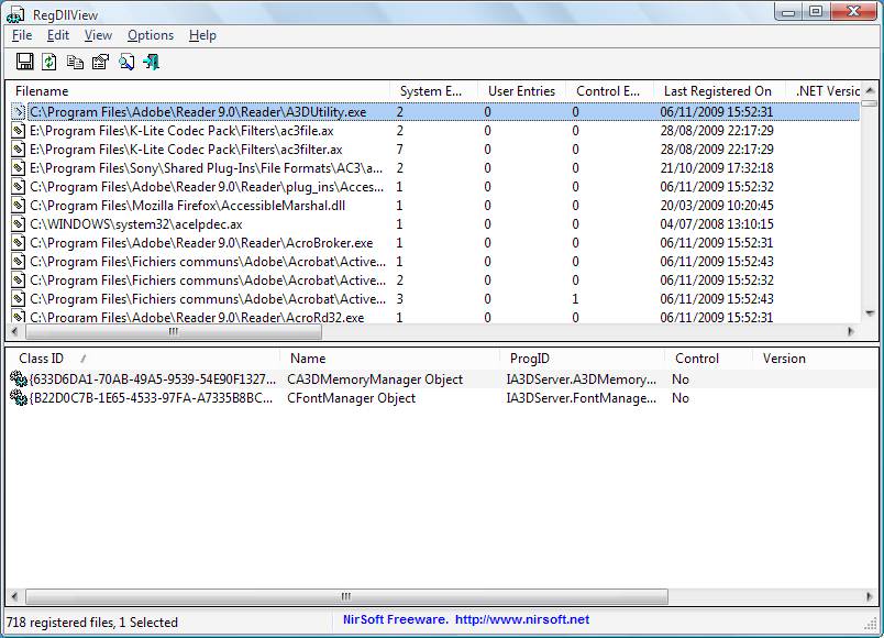 RegDllView is a small utility that displays the list of all registered dll/ocx/exe files (COM registration). For each registered file, you can view the last date/time when it was registered, and the list of all registration entries (CLSID/ProgID).