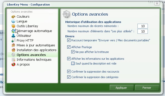 sauf que le menu "configuration Liberkey" m'ouvre une fenetre avec 4 onglets " utilisteur, proxy,mise ajour et installation et rien sur configurer ou options avancées j'utilise la version 4.9
