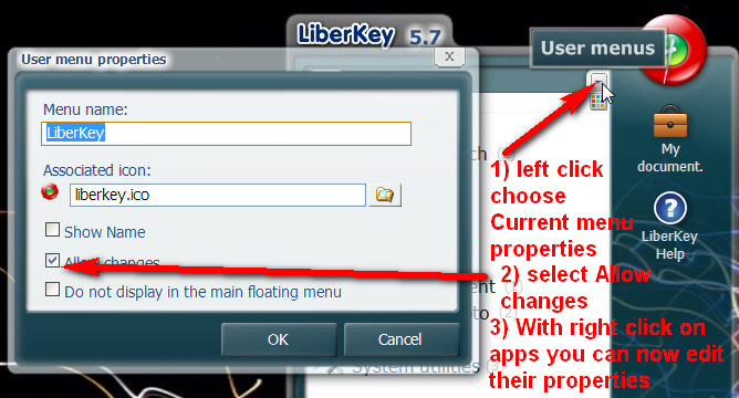 To allow the modifications in the Liberkey menu simply do this : After you can with a right click on each app select the app properties or the shortcut app properties to modify it. Enjoy. JP4U