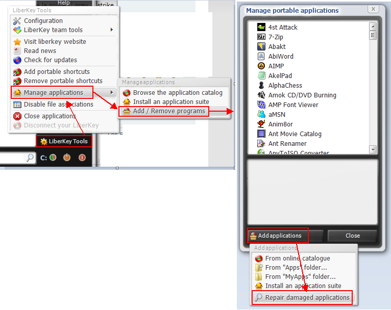 you can try to download a new blank liberkey, and copy the folder "Apps" from the old to the new liberkey folder. After try this: http://www.liberkey.com/fr/forums/download/file.html?id=1620