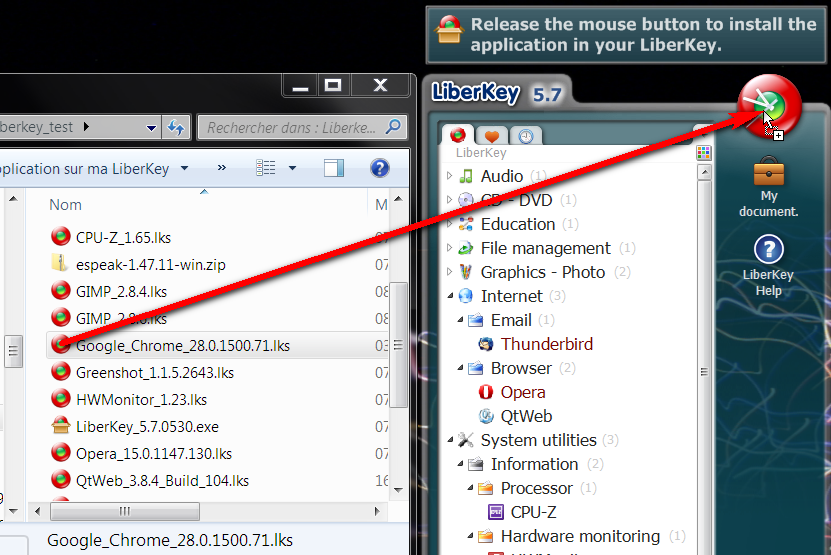 Test it for drag and drop lks on the menu 's logo. Done. Installed Winmerge by Drag and drop, working fine. (Comparation done by Winmerge with default settings) Can you also compare Liberkey.exe in your usual Liberkey and in the one you have just installed. They are identical compare too LKInst.exe ; They are identical compare KeyFileAssoc.exe; They are identical LiberKeyMenu.exe ; They are identical LiberKeyPortabilizer.exe ; They are identical LKAppsClose.exe ; They are identical lkAppsVCheck.exe ; They are identical LkDiskEjector.exe ; They are identical LkEject.exe ; They are identical WAK.exe . They are identical If you find one or more differences in the .exe can you send me. In advance thanks. JP4U No any difference has been found. Can I do new Liberkey installation over old one as Dji advice?