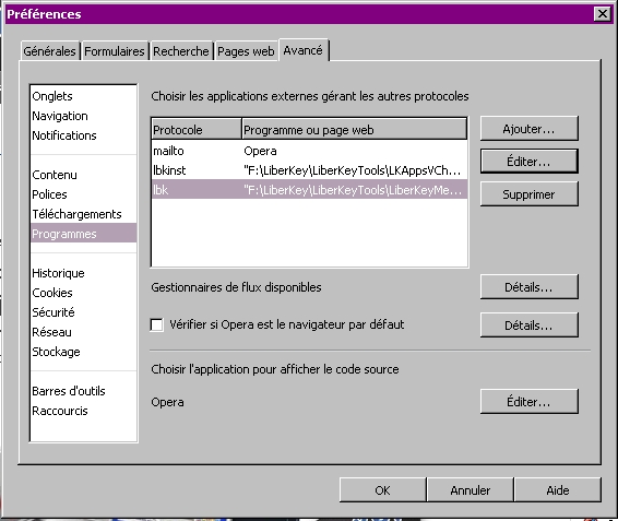 Dans les préférences avancés d'Opera auxquelles tu peux accéder par CTRL + F12 dans l'onglet avancé peux-tu vérifier si dans l'onglet Avancé => Programmes tu as bien un protocole lbk présent avec les données qui lui correspondent comme le montre cette capture Si tel n'est pas le cas il faudrait le créer en passant par le bouton Ajouter puis taper lbk et dans la fenêtre sélectionner Ouvrir avec l'application par défaut. L'application par défaut semble déjà spécifiée dans certains de mes tests , simplement il semble qu'il faille valider l'option dans la fenêtre avant de valider le bouton OK car elle ne l'est pas toujours au départ. JP4U