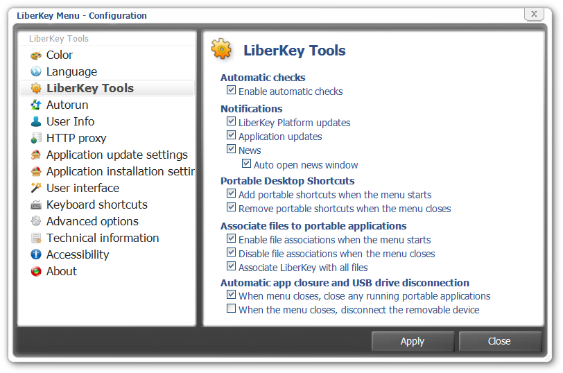To add some shortcuts to computer desktop, simply drag and drop icon of these apps from menus to the desktop. For add and remove it when the Liberkey start or close, you must have checked the lines : Adds portable shortcuts when the menu starts or Remove portable shortcuts when the menu close in Liberkey Tools => Configuration => Liberkey Tools. At the moment, if you want delete one of them, but not all these portable shortcuts you must edit the file PDS.xml in L:\LiberKey\LiberKeyTools\PDS\PDS.xml (L is your letter's drive ) and remove manualy the lines Shortcut name=yourappLKL.exe to /shortcut in DesktopShorcuts section like :