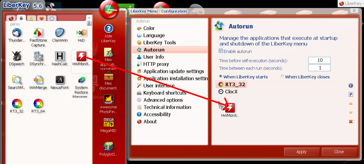 If not, use LiberkeyTools => Manage applications => Add remove programs. In the Manage portable applications left click on Add applications then choose From My Apps folder When you have created a shortcut in these menu, you can use the autorun menu like this method : http://www.liberkey.com/forums/post/rep ... bb_pr33701 . Simply check the case : When the Liberkey closes in the autorun windows not, When the Liberkey starts JP4U