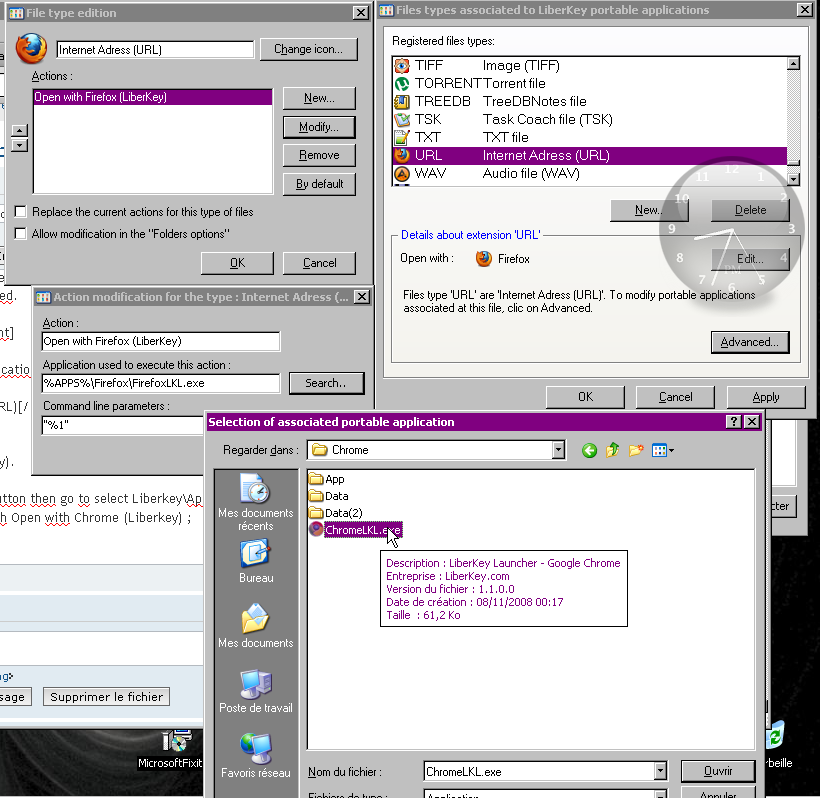 If you dont have already activated the files'association, do it with the menu Liberkey tools => Enable files associations. In the notification zone you have now with the Liberkey icon, the KFA icon. With a right click on it, a contextual menu is opened. Choose File association configuration. In Files types associated to Liberkey portable applications'windows you can see the registered files types or protocols. You can modify it. Select one of them like URL Internet Adress (URL) then click on Advanced button in the rigth bottom on the window. It opens the File type edition 's window. In it, you probably have : Open with Firefox (Liberkey).