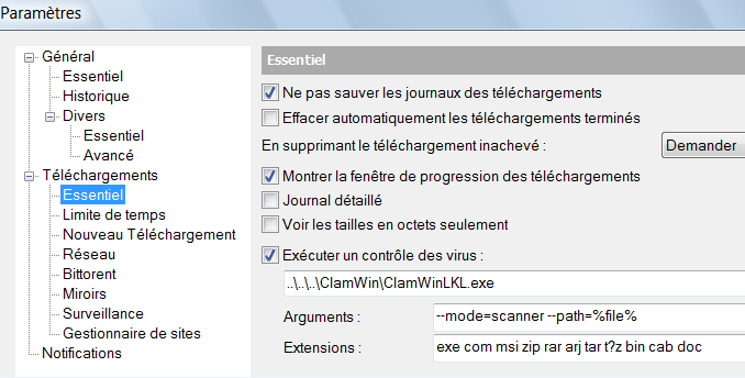 Options -> Options de téléchargements -> Tous les téléchargements Cocher la case Exécutez un contrôle des virus mettre: ..\..\..\ClamWin\ClamWinLKL.exe avec les arguments: --mode=scanner --path=%file%
